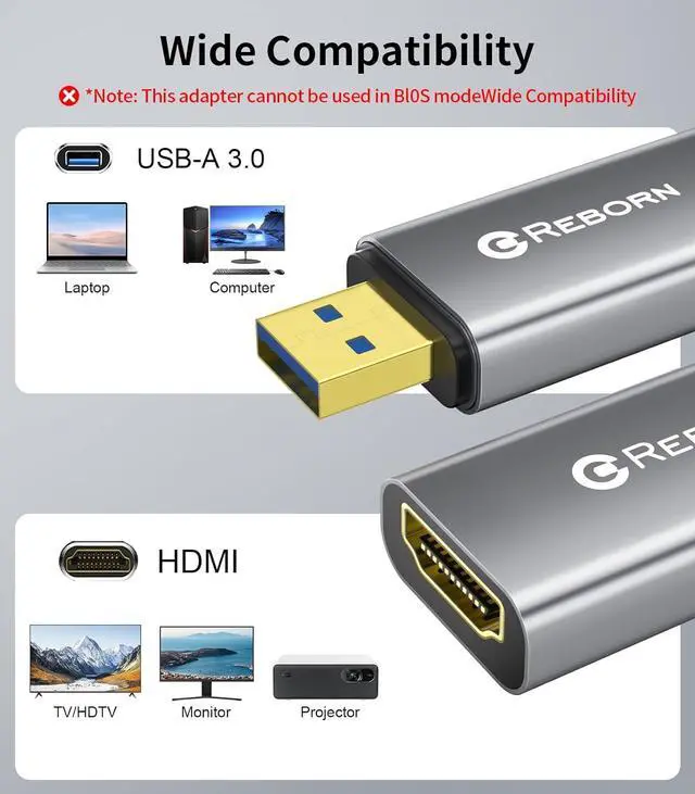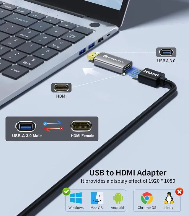 HDMI adapter: The Reborn USB to HDMI adapter a powerful device converts USB to HDMI facilitating connections to HDMI displays. Vital for laptop screen output and multimedia its compactness ensures convenient carrying and instant connection.