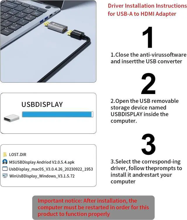 Installation Notes: Before using this USB to HDMI adapter cable a driver must be installed. The process is straightforward. No CD-ROM is required. Connect the device to the computer open the removable disk locate the driver and click install. After restarting the adapter will function.