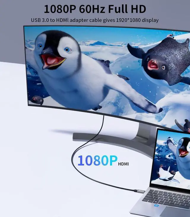 1080P 60Hz Full HD: USB 3.0 to HDMI adapter cable gives 1920*1080 display. Use with computer's HDMI & USB to connect two. If screen res >1920*1080 adjust to 1920*1080. With USB 2.0 or unsupported receiving device output is 800*600. Else it fails.
