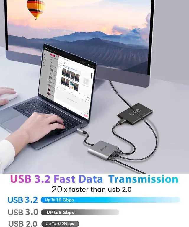 4k HDMI port: The hdmi adapter for macbook air realizes display output function supports mirroring and expansion modes with a maximum resolution of 4K60Hz compatible with 4k30 2K 1080P 720P etc Compatible with mac hdmi adapterr Compatible with usb-c digital av multiport adapter Hdmi adapter for macbook air (NOT for Switch 2) USB A 3.2 Data Por+ 100W USB-C PD Charging PortUp to 10Gbps data transmission speed with the USB 3.2 port transferring your large filles videos and pictures in seconds. This HDMI to USB C adapter supports up to 100W pass-through charging via USB-C PD port so you can power up your laptop while you use the hub.