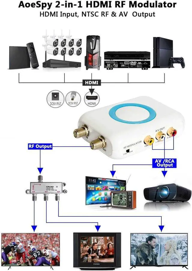 RF Modulator for TV - HDMI in F Type Female coaxial RF out with analog TV signals; No drivers / adapters needed plug and play easily & reliably connect your new HDMI devices to RF coax display. HDMI to RCA - Multifunctional VHF TV modulator also is a hdmi to AV converter for old TV monitor projector vhs player or capture card devices; You will get more benefits and convenience while saving a lot on your local CATV system. rf modulator hdmirf modulator with hdmihdmi rf coaxial converterrf hdmi converterrf hdmi
