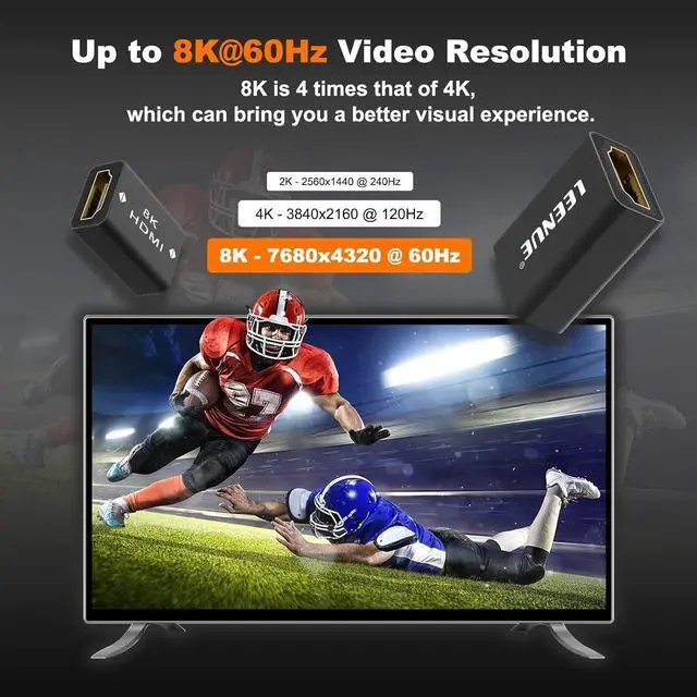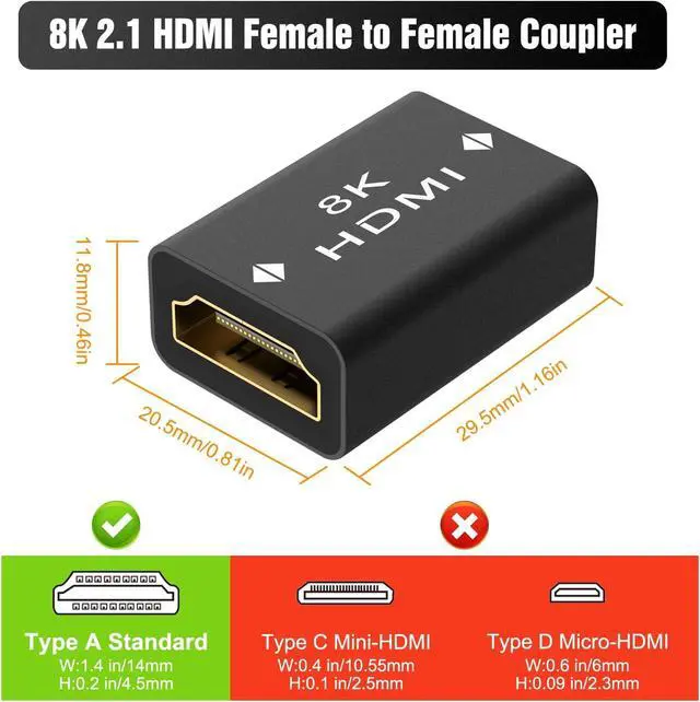 Wide Compatibility - The HDMI coupler female to female allows you to connect two HDMI cables and extend the distance between two devices with Standard HDMI Ports. This is the perfect solution for ensuring a seamless and convenient setup when the decoration/pre-embedded line is not long enough. Vibrant 8K Video - Our HDMI female to female adapter supports stunning 8K@60Hz Video Resolution with a 3D effect four times the resolution 4K. Immerse yourself in breathtaking visuals. Sound Quality - Our adapter supports advanced sound features such as 5.1 Dolby digital sound and Audio Return Channel allowing you to enjoy rich and immersive soundscapes.
