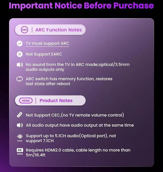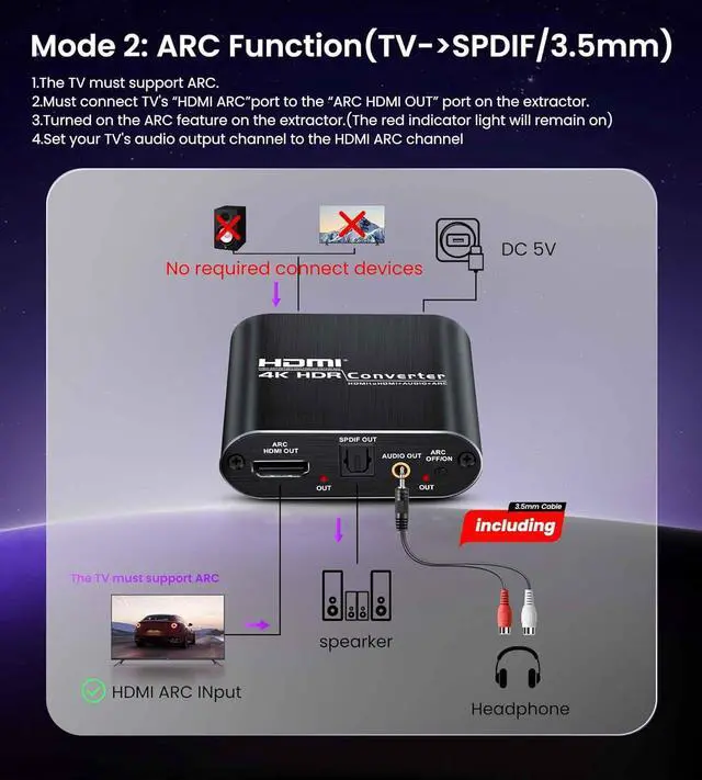 Return Channel) Function: ARC lets your TV send audio to an external sound system (such as a soundbar or receiver) allowing you to enjoy an immersive home theater experience instead of the poor sound of TV.