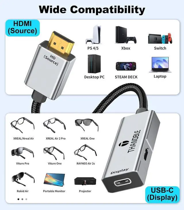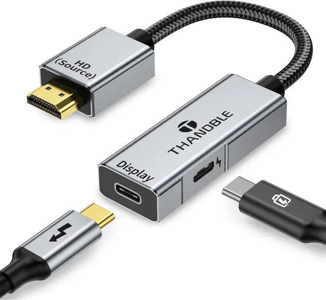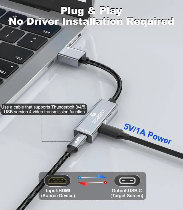 HDMI Output Source Devices: Laptop PC Host Nintendo Switch PS4/PS5 Xbox Steam Deck ROG Ally; (Not compatible to connect KVM/Hub/Dock)About UsTHANDBLE is committed to launching practical products with reasonable price and exquisite design we exclusively provide 24 months warranty the best customer service and professional technical support if there is any question please contact us in time we promise to respond quickly to support within 12 hoursImportant: 1. The adapter only supports HDMI source signal to USB C display one-way transmission (not USB C signal transmission to HDMI please do not connect the HMDI port to the display device) 2. The power cord can not be reversed charging for the device this is used to provide current to the built-in chip in the adapter and can be stable transmission of video to use. 3. The connection of the adapter cable must use the cable that supports the video transmission specifications such as: USB 4 and Thunderbolt 3/4/5 cable