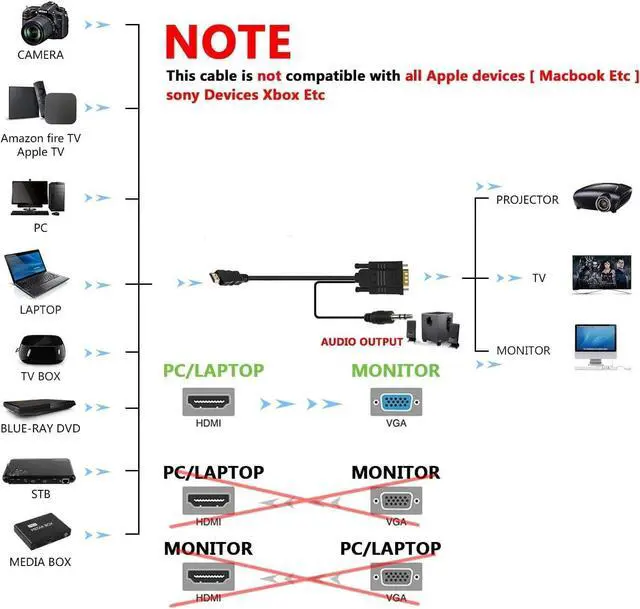 VGA output format: 480i/ 576i/ 480p/ 576p/ 720p/ 1080i/ 1080p/ 60HZ. Support HDMI 1.1 / 1.2 / 1.3 HDCP 1.0 / 1.1 / 1.2.? HIGH-END DESIGN - Gold-plated connector provide rigidity protection and excellent transmission performance; This HDMI cable is made of heavy duty material and this cable coming with a 3.5 mm audio cable for output.??? NOTE - This cable is?? NOT compatible with all devices [ Macbook Etc] PS2/3/4 Etc and Xbox Etc; This is not a bi-directional adapter cable?? can NOT go from VGA to HDMI so you won t be able to use this in reverse.