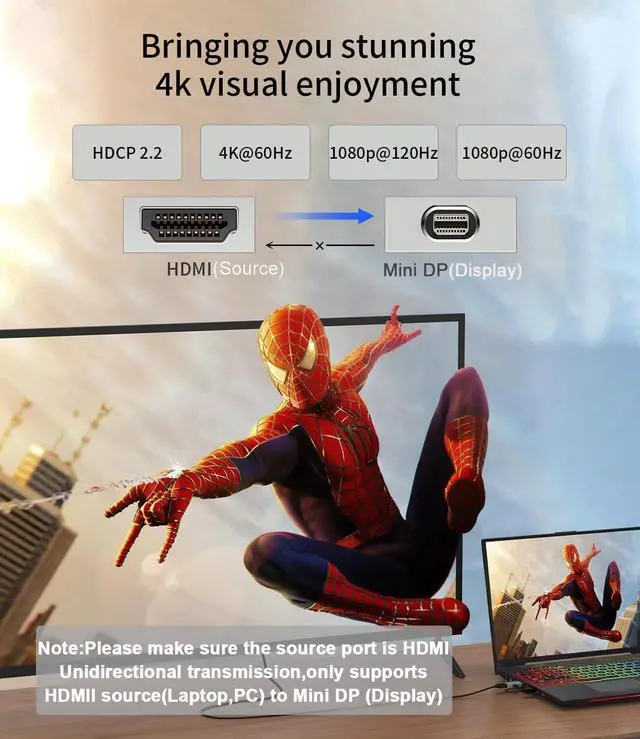 4K Ultra HD Visual ExperienceThis 4K@60Hz HDMI to Mini DisplayPort adapter supports mirroring and extended modes transmitting high-definition signals from laptop and computer HDMI ports to Mini DisplayPort monitors HDTVs and projectorsideal for gaming or streaming media. Backward compatible with 4K@30Hz 1080P@120Hz and 1080P@60Hz.
