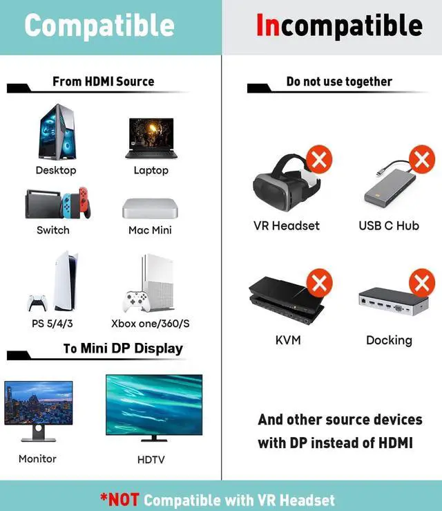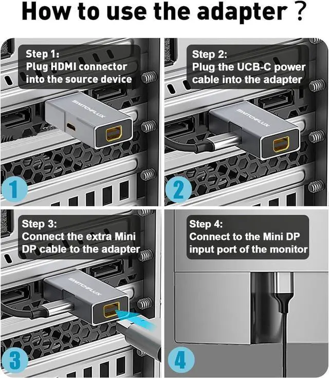 (Note: Not compatible with VR headsets/KVM switches/hubs/docking stations)Premium HDMI AdapterThe 24K gold-plated connectors on this HDMI to Mini DP adapter resist corrosion ensuring stable interference-free video transmission. Its aluminum alloy housing efficiently dissipates heat. This compact lightweight HDMI adapter delivers stunning 4K visuals. (Connect to a micro USB power cable for optimal display performance. )Wide CompatibilityThis HDMI to Mini DisplayPort adapter seamlessly connects all HDMI input devices to Mini DP display devices supporting PCs desktops laptops Xbox 360 Xbox One PS4/PS5 MacBook Pro 2015 Mac Mini and more. Supports HDCP 2.2 / 1.3 / 1.4 and HDMI 2.0 for crystal-clear high-definition visuals. Xbox series and Nintendo Switch support up to 1080p resolution while PS5 supports up to 4K@60Hz. SWITCHFLUXis dedicated to introducing superb-quality products that are sophisticatedly designed and reasonably priced for providing the best solutions to connect your work and life. Consult for fast and responsible support within 18hrs!