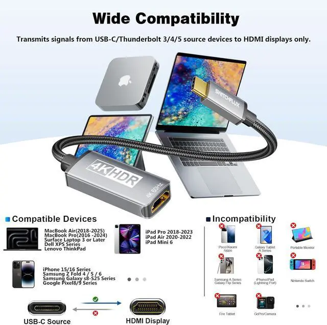 Note: One-way connection only. Supports USB-C source devices to HDMI displaysStable and Durable Premium MaterialsFeatures gold-plated connectors for oxidation resistance an aluminum alloy shell for interference protection and a braided cable body for tear resistance. Combined with triple shielding and tinned copper cores it ensures stable signal transmission and extends service lifeWide compatibilitySpecifically designed for Type-C ports (Thunderbolt 3/4) with video output capability (HDMI Alt Mode). Compatible with iPhone 15/16 series MacBook Pro 2016-2023 MacBook Air 2018-2023 Mac Mini 2018-2023 iPad Pro 2018-2023 iPad Air 2020-2022 XPS 17/15/13 Surface Book 3 Surface Laptop Go Surface Laptop 3 Surface Pro 7 Galaxy S23/S22/S21 and more. Supports mainstream operating systems including Windows Android ChromeOS and macOSSWITCHFLUXis dedicated to introducing superb-quality products that are sophisticatedly designed and reasonably priced for providing the best solutions to connect your work and life. Consult for fast and responsible support within 18hrs!