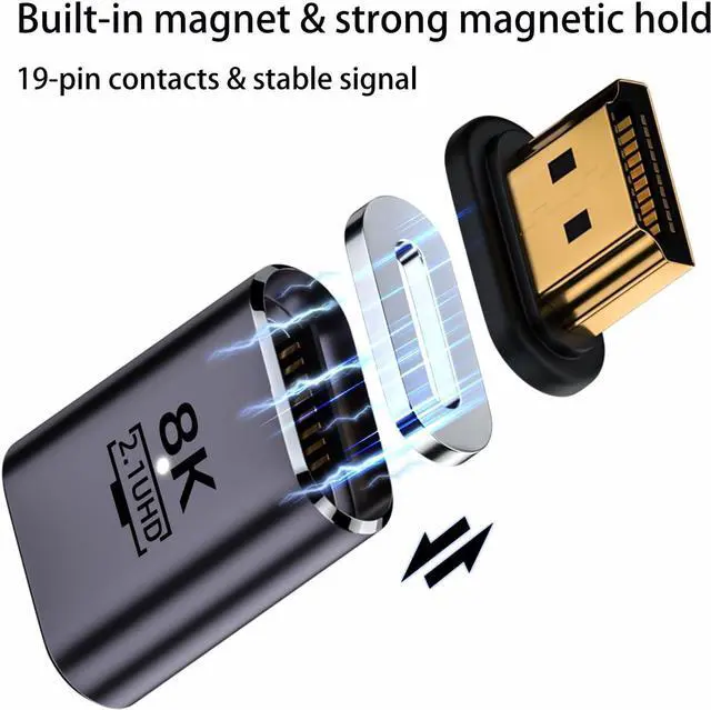 [Detachable Magnetic HDMI Connector] Magnetic design allows the connector to detach easily when excessive force is applied reducing stress on the HDMI port and minimizing damage from repeated plugging and unplugging. [4K@120Hz & 8K@60Hz HDMI 2.1 Compatible] Supports resolutions up to 8K@60Hz and 4K@120Hz. Complies with HDMI 2.1 standard making it ideal for high-quality gaming streaming and professional video output. [Gold-Plated Pins for Stability and Durability] Gold-plated contacts ensure stable signal transmission while preventing oxidation and corrosion providing high-quality data transfer and long service life. [Compact Design Wide Device Compatibility] Small and lightweight to minimize strain on ports and cables.