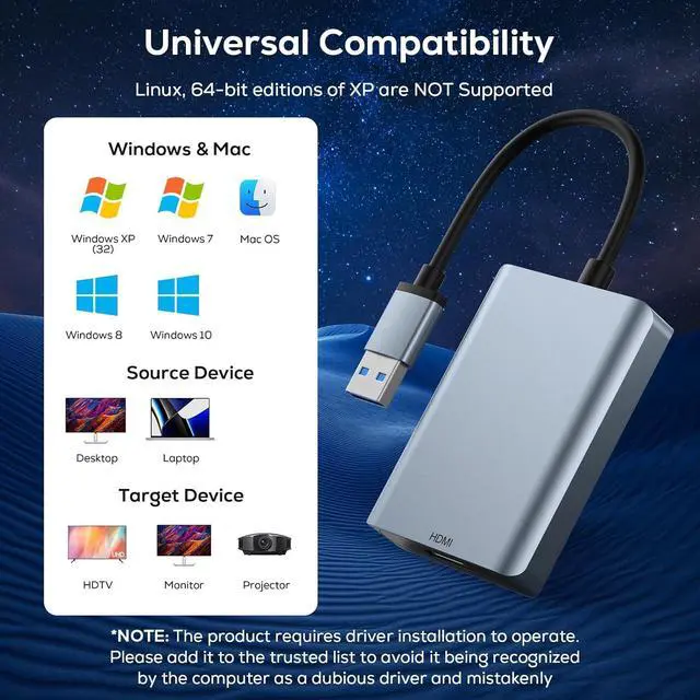 (Note: Driver installation is required before use. If an unregistered driver alert appears on certain systems rest assured? you can safely run it. The driver operates locally onlyNEVER connects to networks solely projects your display and does not collects data ensuring secure usage. )