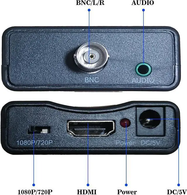 SPECIFICATION: This adapter could detects PAL or NTSC signals automatically supports 720P@50~60Hz 1080P@50~60Hz HDMI output resolution you can switch between 4:3 and 16:9 modes freelyThis bnc to hdmi adapter input: 1. CVBS BNC analog video signal 2. aux 3.5 mm audio signal output: HDMI output it also have 720P/1080P switch.