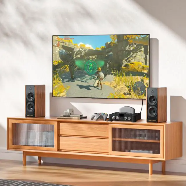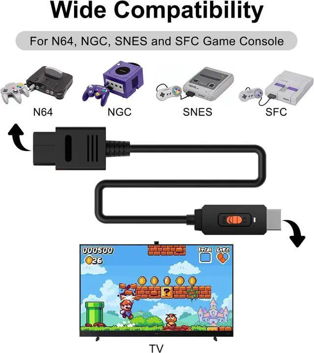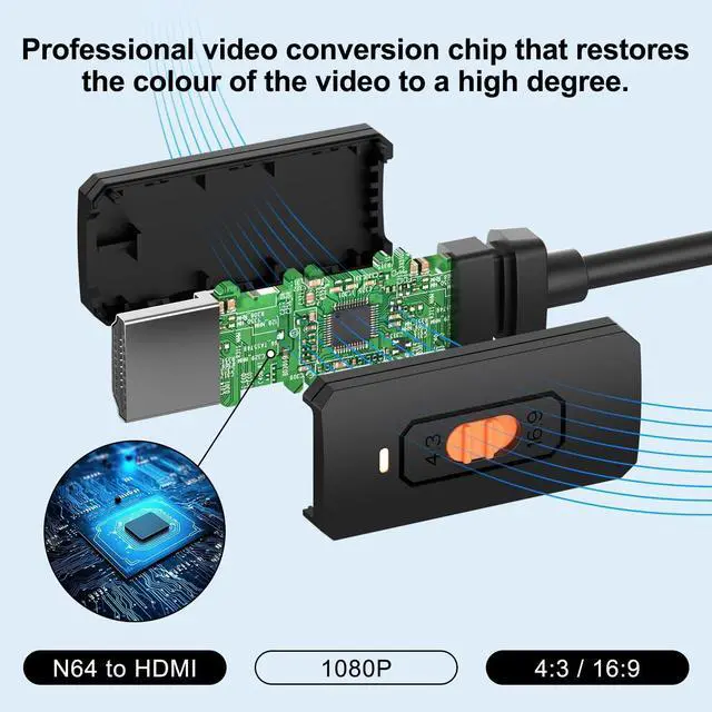 ? 4: 3 / 16: 9 Ratio Conversion Supports 4: 3 / 16: 9 aspect ratio output switching allowing you to fully experience the stunning pictures of classic Nintendo games and enjoy high-quality game time.? N64 to HDMI Converter This N64 to HDMI Converter can enhance your gaming experience by playing games or streaming your favorite vintage Nintendo games on any device equipped with HDMI.? Plug and Play Simply plug and play with our N64 to HDMI adapter to instantly improve your gaming experience with no drivers needed.? Wide CompatibilityYou can connect your favorite classic Nintendo game console with this N64 to HDMI adapter which also serves as an N64/NGC/SNES/SFC.