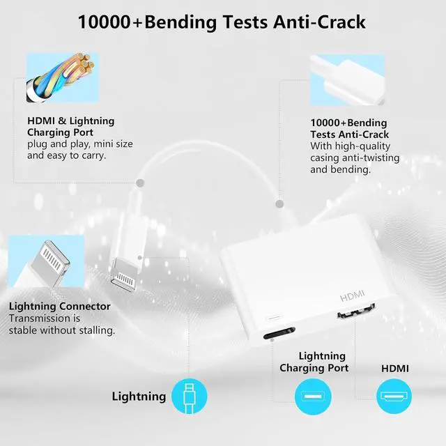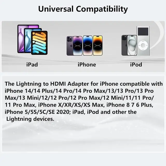 (Please Note: 5V 1A USB Charging cable MUST be plugged before use. )The Lightning to HDMI adapter for TV enable support for multiple devices This iPhone to HDMI adapter Compatible with iPhone 14/14 Plus/14 Pro/14 Pro Max/13/13 Pro/13 Pro Max/13 Mini/12/12 Pro/12 Pro Max/12 Mini/11/11 Pro/11 Pro Max iPhone X/XR/XS/XS Max iPhone 8 7 6 Plus iPhone 5/5S/5C/SE 2020; iPad iPod and other the Lightning devices it supports iOS 17 system and before. The pocket size Lightning to HDMI Adapter for iPhone Digital AV Audio Dongle 1080P Sync Screen Cable with Lightning Charging Port allow you to carry it everywhere. Watch your media or deliver your presentation on a bigger screen wherever it is most convenient. a 5-year worry-free warranty and 24/7 friendly customer service. Any questions about the lightning to HDMI Adapter please contact us for fast support we will reply within 12 hours.