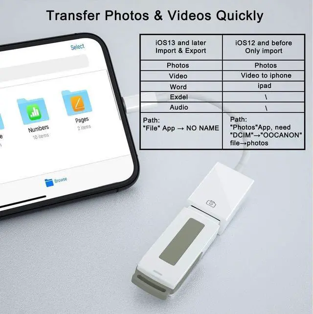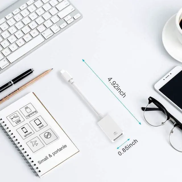 and Play no app. Compact portable convenient to use. Strong Compatibility The USB to iPhone adapter is compatible with iPhone 14/ 14Pro/ 14Pro Max/ 13/ 12/ 11/ 11 Pro/ 11 Pro Max/ Xs/ Xs Max/ X/ 8/ 8 Plus/ 7/ 7Plus/ SE and iPad Air / Mini /Pro.