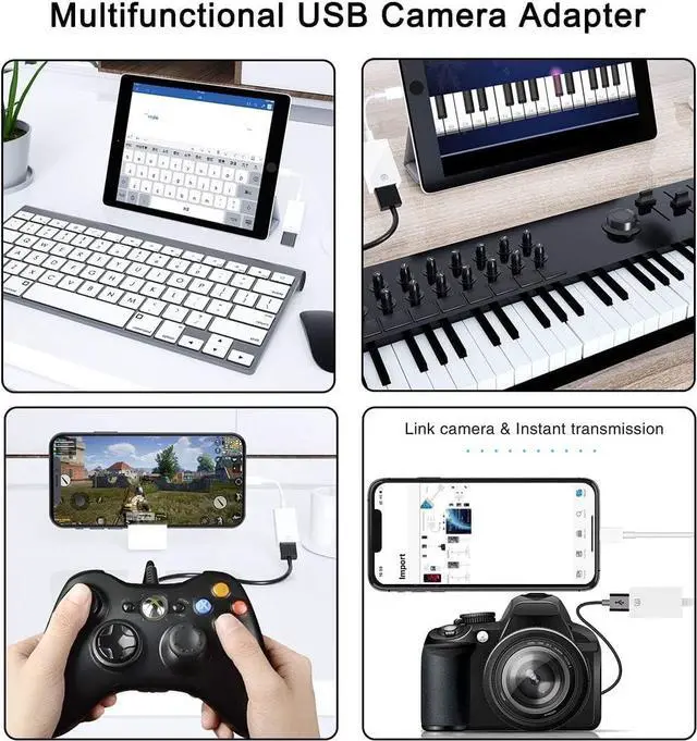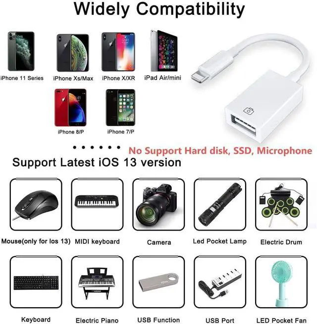 Easy to Share No APP required Plug and play you can easily share your photos to social media; or you can transfer file from U disk or memory card to your iPhone/iPad. Supports photos in JPEG and RAW formats SD and HD videos in H. 264 and MPEG-4 formats. Stunning Features Supports connection of USB flash drive USB mouse keyboard MIDI keyboard electric piano drums mixer and other devices. This iPhone USB adapter is the best choice to extend more functions to your phone or tablet. No Support Hard disk SSD Microphone. Easy Data Import and Export Supports two-way data transfer for iOS you can import pictures videos MP3 files MP4 files Excel Word PPT PDF import and export files or photo app from the plug camera to phone pad.