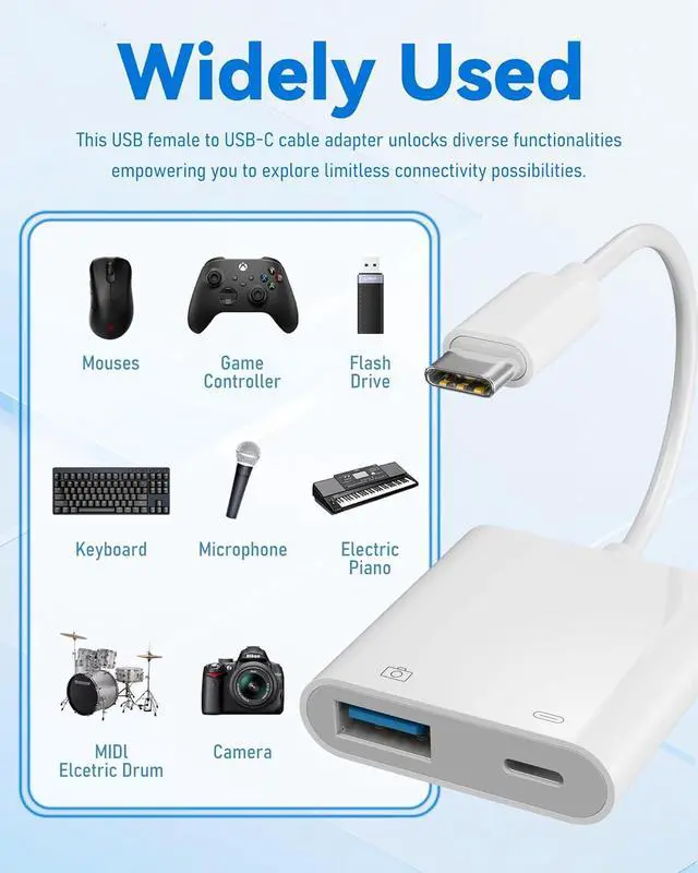 Fast & Reliable Data TransferEasily connect USB flash drives keyboards mice and other USB devices to your USB-C smartphone tablet or laptop with this high-speed USB C to USB OTG adapter. Perfect for fast data transfer and on-the-go file managementUniversal USB-C CompatibilityUSB C to USB A adapter works seamlessly with a wide range of USB-C devices including Android phones Pad Pro Mac-Book Galaxy 23 24 Pixel and more. A must-have USB OTG adapter for Android users and modern devicesPlug & Play ConvenienceNo drivers or apps needed simply plug in and use. This Type C OTG adapter instantly connects your USB peripherals to your USB-C device making file transfers media viewing and peripheral use easier than ever.