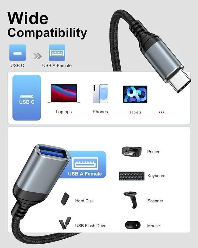 [Durable and Reliable] Built with a high-quality shell that helps dissipate heat during charging and data transfers this Type-C otg adapter is made to last. Its tough enough to handle daily wear and tear resist stretching and deliver long-term durability you can count on. [Wide Compatibility] This flexible and durable USB C to USB otg adapter adapter works seamlessly with a wide range of USB-C devices Compatible iPhone 17/17Pro/17Pro Max/Air/16/16 Pro/16 Pro Max/16 Plus iPhone 15 series MacBook Pro/Air iMac Mac iPad mini (2024) iPad Pro/Air 11 & 13 (2024) iPad 10th Gen iPad Pro 12.9 (Gen 36) iPad Pro 11 (Gen 14) iPad Air (Gen 46) iPad mini 8.3 (Gen 6) Galaxy S25/S25+/S25 Ultra/S24 FE/S24 and many other USB-C devices.