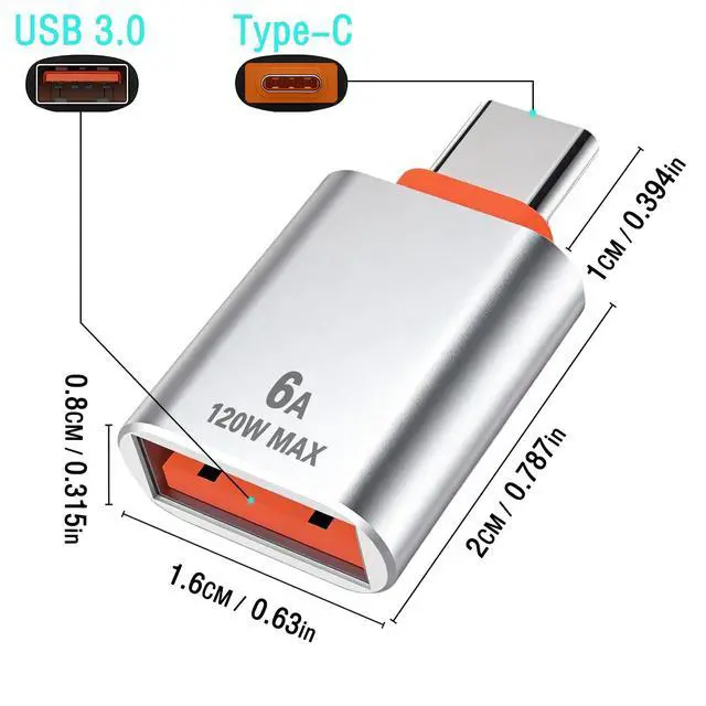 USB port: USB Stick / USB Hub / Hard Disk / Card Reader / USB Cable / Camera / Flash Disk / Mouse / Keyboard / Games Console / Card Reader / Printer / Microphone. [OTG Adapter for Android & More] This 2-pack USB C OTG adapter allows Android phones and other USB-C devices to connect to USB 3.0 accessories like flash drives keyboards and mice. Expand your devices functionality with ease. [6A & 120W Max ] Equipped with USB 3.0 technology this USB C to USB adapter supports up to 6A 120W power delivery fast charging. [Sturdy & Portable Design] Crafted from durable materials with a sleek silver finish these compact adapters are built to last. Carry them anywhere for on-the-go connectivity without adding bulk. [Plug-and-Play No Drivers Needed] Enjoy instant connectivitysimply plug in the USB C male to USB 3.0 female adapter and its ready to use. No additional software or drivers required for most devices. [What You Get] 2 × USB C to USB Adapter Silver.