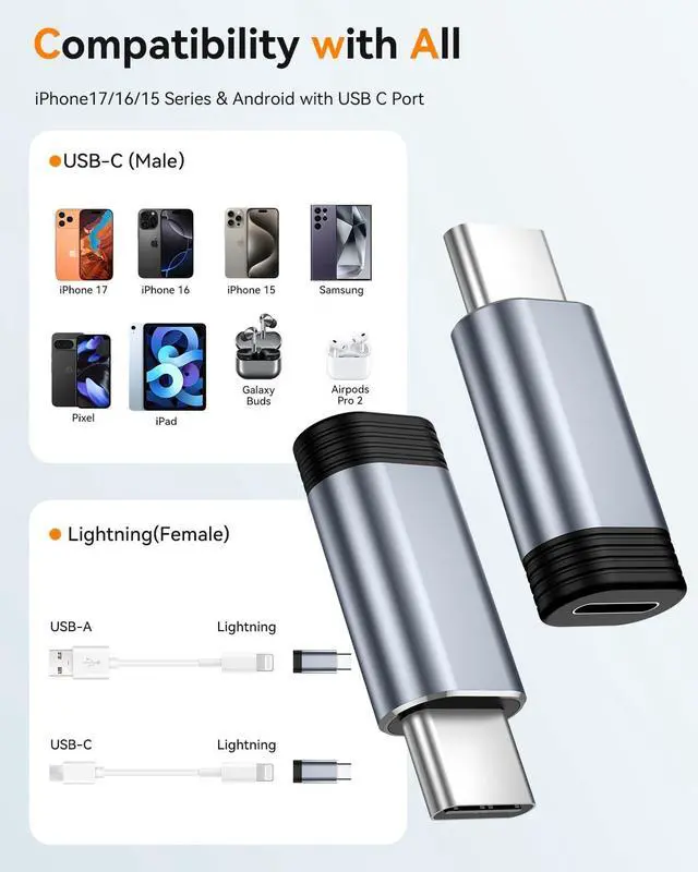 USB C Adapter: Crafted from aerospace-grade aluminum alloy for superior durability rigorously tested to withstand 20 000+ plug/unplug cycles. Instantly converts your Lightning cable to USB C - no extra cables needed. Plug-and-play convenience for seamless charging and data transfer between all iPhone models. The ultimate space-saving solution for your mobile essentialsCompatibility: Reversible USB C connector allowing you to plug it in either orientation for maximum convenience. Compatible with iPhone 17/17 Pro/17 Pro Max/17 Air/16/16 Pro/16 Pro Max/16 Plus/15/15 Pro/15 Pro Max/15 Plus Google Pixel 7/6/5/4 Galaxy Z Flip 5 Galaxy Z Fold 5 Galaxy S25/S24/S23/S23 Ultra/S23+/S22/S21/S21 Plus/ S20/Note 20/ 20 Ultra/ 10/ 10 Plus HTC U12 LG V50 and other devices that are using USB Type C cable
