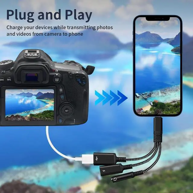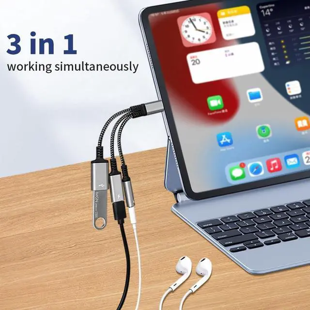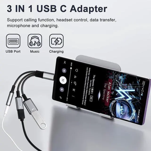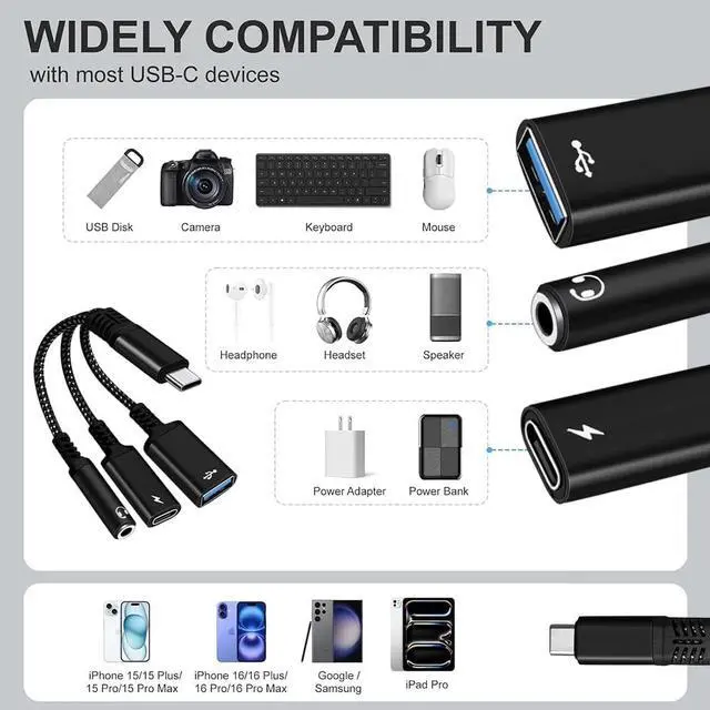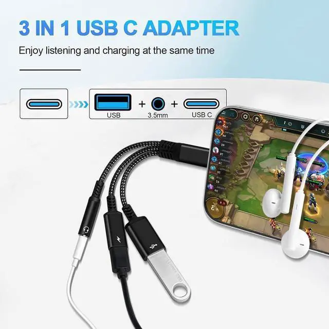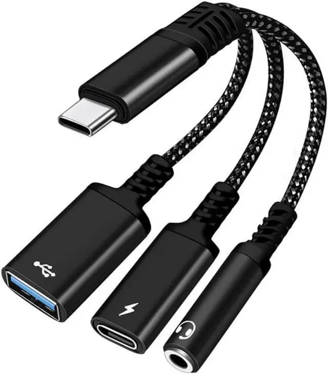 3-IN-1 USB C TO USB ADAPTER - The aux to USB C to USB adapter with USB OTG port a USB C to 3.5 mm audio adapter and a USB C charging port. The aux to USB C to USB adapter supports multiple ports working simultaneously so you can charge your device while listening songs making calls or transferring files. Stylish lightweight aux to USB C to USB adapter is the best choice for travel/home/office. MULTI-FUNCTION USB OTG ADAPTER - The aux to USB C to USB adapter supports transferring files to your USB C devices (such as Excel Word PDF MP3 MP4 JPEG or RAW and more) transmission speed is 480Mbps/5G bps.