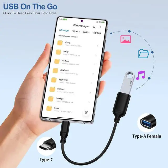 USB OTG Cable On-The-Go: This usb otg adapter converts a USB-C (Thunderbolt 3) port into a USB 3.0 interface enabling connection to external hard drives flash drives USB drives keyboards hubs mice and other USB OTG-enabled peripherals. The iphone 17 usb c to usb 3.0 adapter allows smartphones tablets and laptops to read and transfer data. Video output is not supported.