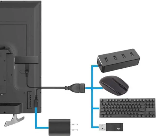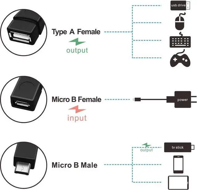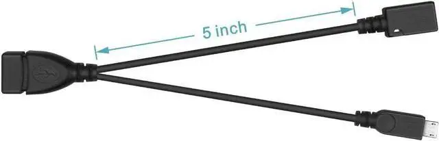 This OTG adapter cable allows you to connect any USB peripherals e. g. wired or wireless mouse keyboard USB drive USB card reader USB Ethernet adapter game controller and more to your host devices e. g. TV stick Android or Windows smart phone and tablet USB type A female to Micro USB male and female (Micro USB female is designed for power input) overall length of the cable is around 8 inches which is portable and convenient for use Comparing with regular OTG cable this cable can power on those USB peripherals so as to avoid the battery of your phone or tablet draining too fast (Attention => This cable can NOT charge your Android phone or tablet but it can power on your TV stick) Plug and Play easy to install for the details of connection method please refer to the 2nd image of the product page.