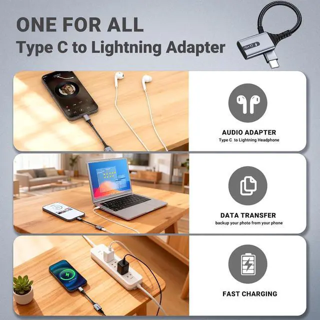 Multifunction: Charge Listen & Transfer SimultaneouslySay goodbye to dongle chaos! This all-in-one adapter allows you to charge your iPhone 15 / iPad Pro use your favorite Lightning headphones (like EarPods) and transfer data to your PC at the same time. No more choosing between power and music. Never Stop Your Music or GameTired of pausing your game or movie just to charge? Our adapter is your perfect solution for uninterrupted entertainment. Keep your device powered up while enjoying lag-free high-fidelity audio through your wired Lightning headphonesideal for gamers and movie lovers. Revive Your Lightning Earphones & Sync DataDon't retire your prized Lightning accessories! Effortlessly connect your original EarPods or any MFi-certified Lightning headphones to your new Type-C devices. Plus enjoy fast and stable data syncing (USB 2.0 speed up to 480Mbps) for backing up photos and files to your computer. Broad Compatibility with Type-C Ecosystem Works seamlessly with a wide range of devices: iPhone 15 Series iPad 10 iPad mini 6 iPad Air/Pro MacBooks and most Type-C Android phones/tablets. It's the universal key to unlocking the full potential of your modern gadgets. Safe & Stable Connection GuaranteedWe prioritize your device's safety. For optimal performance and to avoid potential damage we strongly recommend using original or MFi-certified Lightning cables and headphones. Features built-in 16bit/48kHz DAC for clear sound and low power consumption.