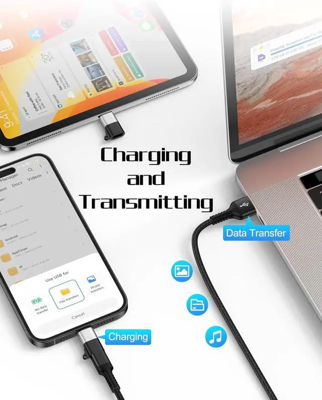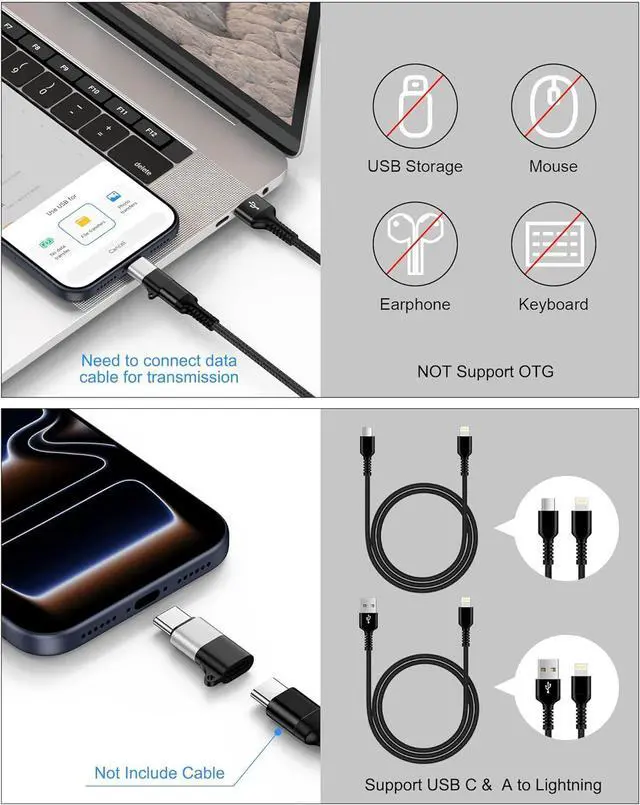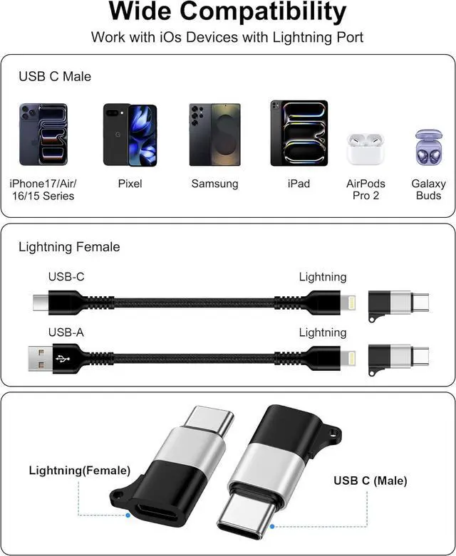 Not Supported: OTG functions video/audio transmission music playback wired earphones/headphones/earbuds CarPlay apps Pencil (1st gen) flash drives USB sticks SD card readers Square readers printers microphones cameras mice keyboards USB hubs HDMI/VGA adapters or any other OTG-dependent accessories. Plug and PlayThe reversible lightning to usb c adapter lets you plug it in either direction for added convenience. Compatible with iPhone 17/17 Pro/17 Pro Max/Air/16/16 Pro/16 Pro Max/16 Plus/15/15 Pro/15 Pro Max/15 Plus Google Pixel 10/9/8/7/6 Galaxy S25 Ultra/S25/S24/S23 FE/S22/S21/Note 20 Z Fold 7/6 Z Flip 7/6 Google Pixel 10/10 Pro XL/9/9Pro/8/7a/6 Pro/5 HTC U12 LG V50 and other devices that use a USB-C cable including Nintendo Switch. Support Charging & Data SyncThis usbc to lightning adapter (2-pack) supports charging and data sync between USB-Cenabled devices (iPhone/iPad) and computers. Transfer files at speeds up to 480 Mbps with stable performance and reliable connectivity. No drivers or setup requiredsimply plug and play. Durable & Convenient DesignThis adapter lighting to usb-c features a sturdy aluminum alloy housing that withstands repeated plugging and unplugging without bending or breaking. It instantly converts your Lightning cable into a USB-C cable eliminating the need to carry multiple cables on the go.