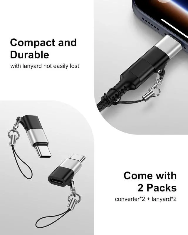 Designed for durability and ease of use this Lightning female to USB-C male adapter delivers reliable long-lasting performance. Compact & Travel-ReadyThis lightning to usb c adapter features a lightweight aluminum construction suitable for portable use at airports hotels and charging stations. It includes a hanging rope for secure grip and organization enabling convenient quick charging on the go.