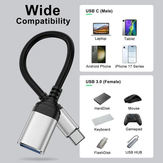 Wide CompatibilityThe USB C Female to USB Male Adapter Works perfectly with USB C laptops smartphones and tablets including iPhone 17/17 Pro/17 Pro Max/Air/16e/16/16 Pro/16 Pro Max/16 Plus/15/15 Pro/15 Pro Max/15 Plus Galaxy S25/S25 Ultra/S25+/S24/S24 FE/S24 Ultra/S24 Plus/S23 Ultra/S23/A17/A56/A36/A16/A55/A35/A15/A14 5G/Z Flip7/Z Flip6/Z Fold7/Z Fold6 MacBook Pro MacBook Air iPad Pro iPad Air Google Pixel 10/10 Pro/10 Pro XL/10 Pro Fold and more devices with type-c ports. Premium DesignWired design extends the distance of use avoiding blocking other USB C ports and not easily lost. With durable tpe material and wear-resistant aluminum shell USB C adapter is far more durable.