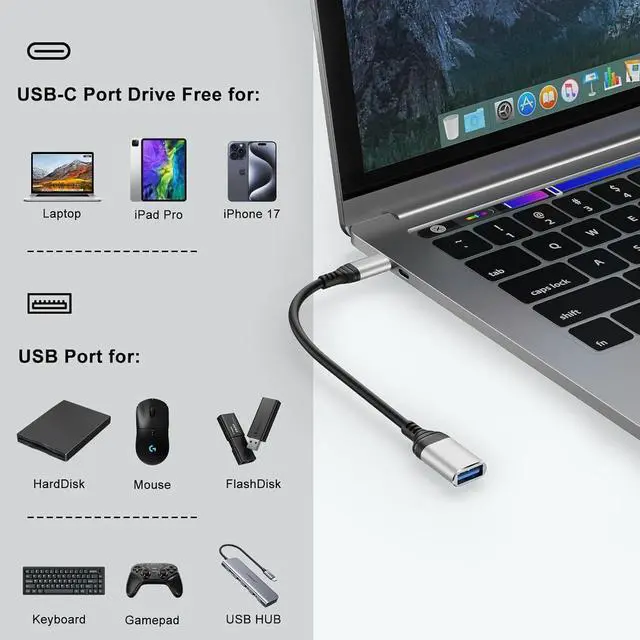 Plug and PlaySimple plug and play USB to USB C adapter no drivers needed. This usb c male to usb female converter cable makes your USB C devices fully compatible with USB drives. No complicated setup is required just plug it in and start using. Wide CompatibilityThe usb c otg adapter is compatible with iPhone 17/17 Pro/17 Pro Max/Air/16e/16/16 Pro/16 Pro Max/16 Plus/15/15 Pro/15 Pro Max/15 Plus iPad Pro iPad Air 11 inch 5th/4th Gen iPad Mini 6th Gen MacBook Pro MacBook Air MacBook Laptop Mac iMac Galaxy S25/S25 Ultra/S25+/S24/S24 FE/S24 Ultra/S24 Plus/S23 Ultra/S23/A17/A56/A36/A16/A55/A35/A15/A14 5G/Z Flip7/Z Flip6/Z Fold7/Z Fold6 Google Pixel 10/10 Pro/10 Pro XL/10 Pro Fold/9a/9/9 Pro/9 Pro XL/9 Pro Fold/8a/8/7/7 Pro/6/5/4/4 XL and more.