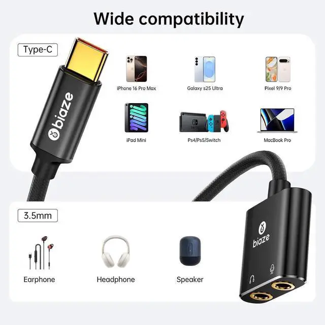 USB Stereo Sound CardThis biaze USB audio adapter is ideal to replace your faulty sound card or audio port. It extends the 3.5mm mono microphone input and speaker-headphone output via the USB C port, allowing you to connect small speakers, headphones, microphones, dual-plug headphones and more