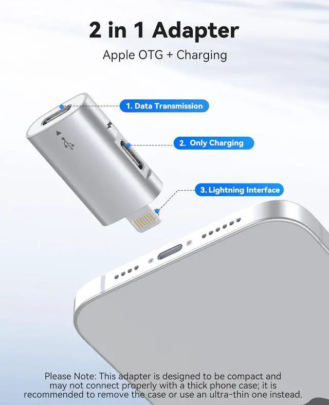 OTG + Charging Adapter: This product with a USB-C female to Lightning male adapter and a USB C charging port, enable simultaneous data transfer and charging.