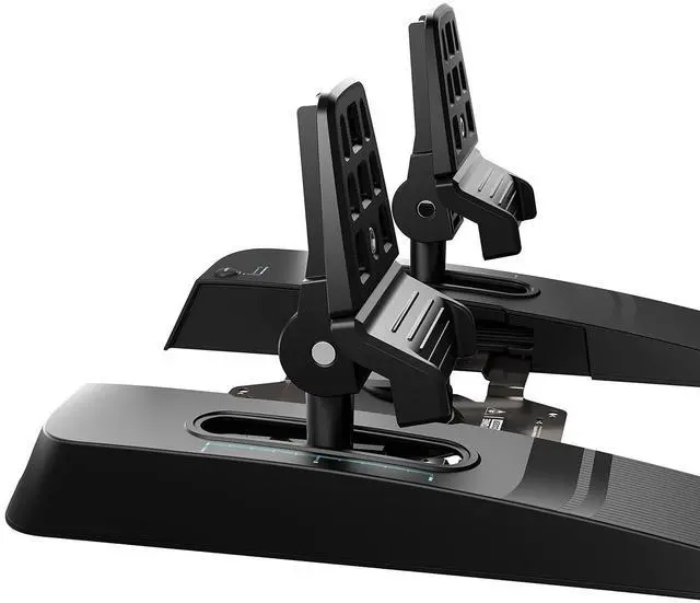 The Turtle Beach VelocityOne Rudder Universal Rudder Pedals are designed for use with Windows PCs, Xbox Series X, and Xbox Series S, providing precise control for flight simulation games. The pedals feature adjustable brakes, allowing for a customizable and responsive gaming experience. Built with durability in mind, these pedals offer long-lasting performance, while their ergonomic design ensures comfort during extended gaming sessions. The sleek black design complements other VelocityOne products, and the easy-to-use pedal system enhances overall control for a smooth and immersive experience in flight simulations.
