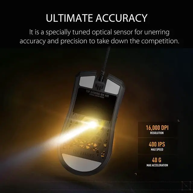 - BUILD QUALITY & FEEL - The TUF Gaming M4 Air is crafted with a solid construction. When gripping the mouse, there are no squeaking or creaking sounds from either the side panel or top cover. The optical sensor offers sensitivity as high as 16,000 DPI, the on-the-fly DPI button of the mouse allows gamers to cycle through four levels of sensitivity depending on their needs.