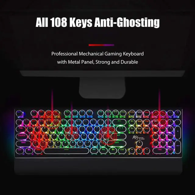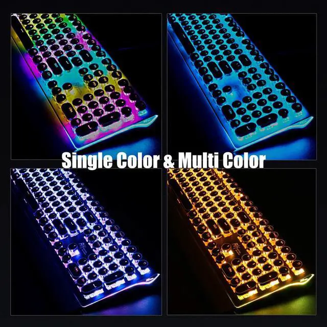 [Retro Typewriter Style with Mechanical Keys] - Mechanical blue switch for ultimate gaming performance. The mechanical keys offer medium resistance?? audible click sound & tactile feedback. Vintage steampunk round keycaps looks like a classical typewriter?? brings you comfortable typing feeling & stable clicking touch. [Ergonomic Design with Detachable Wrist Rest] - The ergonomic ABS palm rest provides firm support that alleviates pressure on your wrist from gaming at an elevated angle. [True RGB LED Backlit Light Up Keyboard] - This RGB illuminated keyboard has up to 168 LED backlit modes and 7 color sidelight. Press "Fn+Pause" to change the global backlight color?? supports single color mode and RGB color mode.