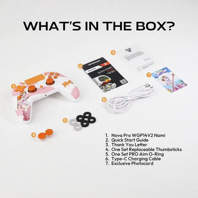 Complete Accessory Pack & Long Battery Life: Comes with extra thumbsticks, PRO Aim O-Rings, a Type-C cable, exclusive photocard, and quick start guide. The 1000mAh battery provides up to 12 hours of wireless play.