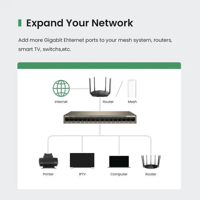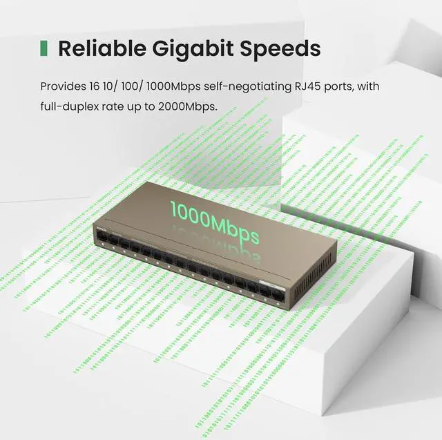 PORT CONFIGURATIONGigabit switch equipped with 16 10/ 100/ 1000Mbps Auto-negotiating MDIX RJ45 Ethernet ports. Add more Gigabit Ehternet ports to your Mesh System, Routers, etc