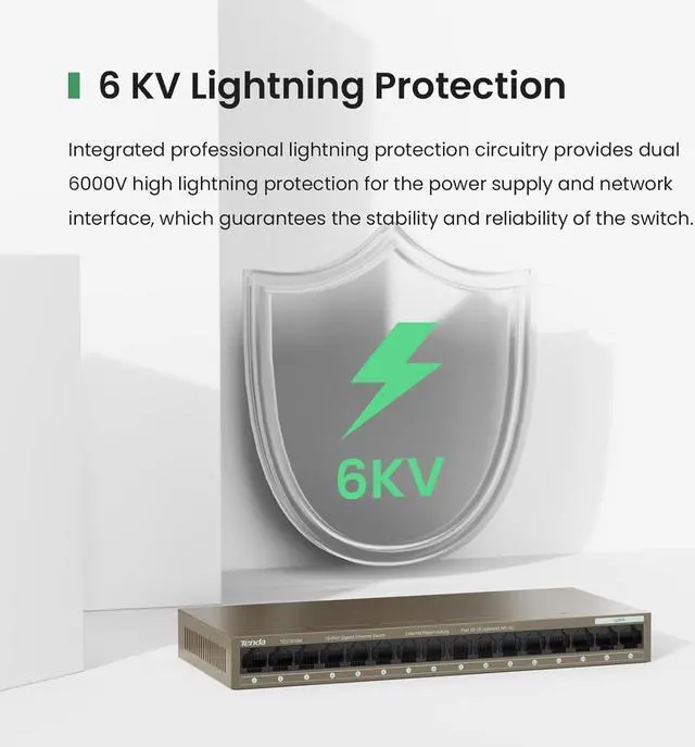 EXCELLENT LIGHTNING PROTECTIONWith professional lightning protection circuit, all ports and power supply module feature 6 KV lightning protection, greatly protecting the switch from being damaged by thunder storm
