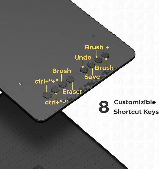 Computer Graphics Tablet-Customized ShortcutsThe eight, round, customizable shortcut keys that fits easily to your finger tip can be programmed to many different software programs.