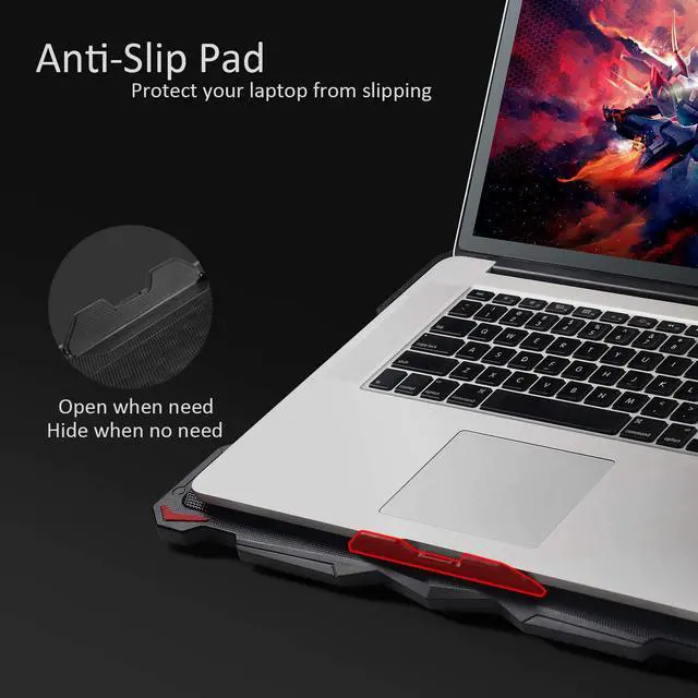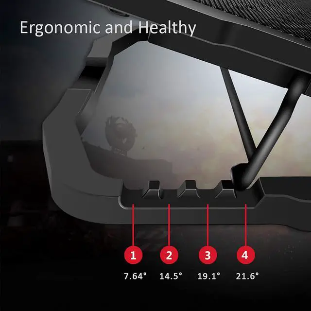 The laptop cooler pad can help laptop to raise the height from 2.4 " - 4.8 ", and the angles are available to be adjusted from 7.5 - 21.5 degrees. Help to relieve neck pain caused by prolonged computer use and incorrect posture. This cooling pad for gaming laptop has a rhombus hollow metal mesh surface, it will conduct and dissipate part of the laptop' s heat, due to the thermal conductivity of the metal.