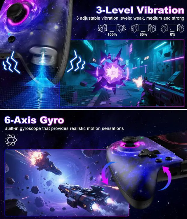 Ultimate Gaming Immersion with One-Piece Joypad : Our switch controllers features 6-axis gyroscope that can detect the tilt allowing precise aiming and movement. The dual vibration motor provides excellent feedback with 3 levels of accuracy, enhancing your gaming experience even further. The turbo switch handheld controller offering 3 selectable speeds: 5/s, 12/s, and 25/s for lightning-fast attacks that gets you one step closer to victory