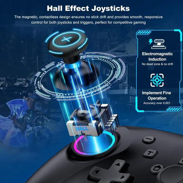 Anti-Drift Hall Effect JoystickThis pc gaming controller features precision Hall Effect joysticks with anti-drift protection. Activate temporary 0 deadzone mode by holding T + R3/L3] Stick (green light confirms) to eliminate input lag for competitive FPS/MOBA games. Revert to default calibration instantly with the same combo (blue light indicator). Pro Tip: Automatically resets to factory default settings upon restart to ensure consistent anti-drift performance.