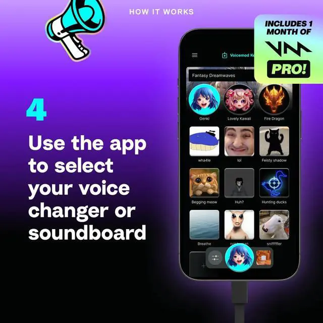 We use the power of your smartphone! Voicemod Key sits between your headset and your console—and uses the Voicemod mobile app to change your voice in real-time. Once we’ve done that little bit of magic, your new voice is sent to your console voice chat. Works with soundboards too!