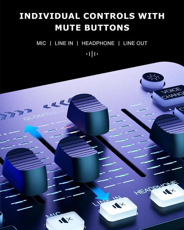 • INDIVIDUAL CONTROLS: Volume slider with mute buttons for Mic/Headphones/Line in/Line out.