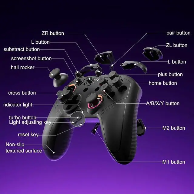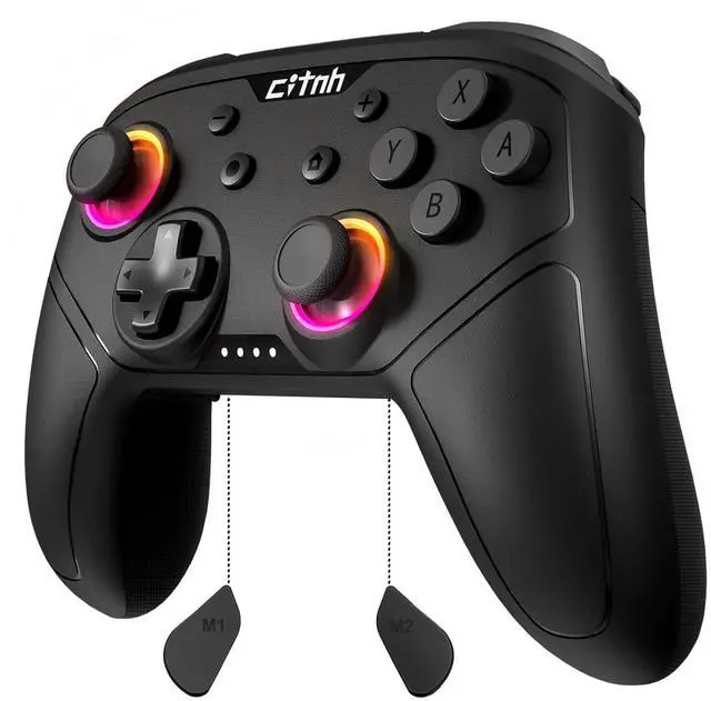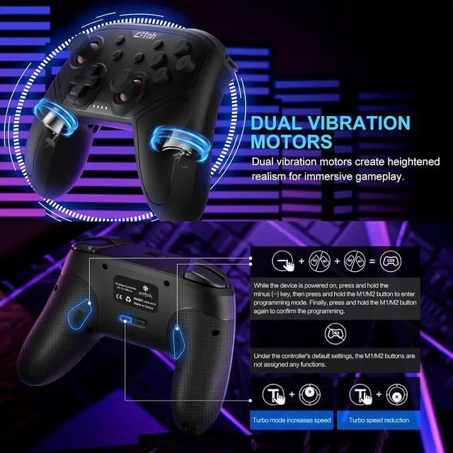 The switch wireless controller has two M1/M2 macro programming back keys to support 14 key settings, which improves the player's experience of the game.At the same time, it also has a turbo function. It is divided into 3 trigger speeds and elite controller configurations.