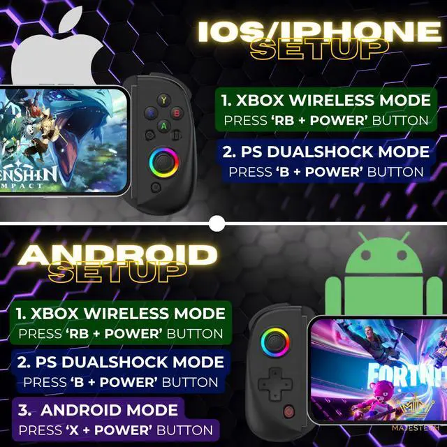 1. Xbox Controller Mode: Long press both ''RB + Power'' button until the LED blinks fast, then go to your phone's Bluetooth settings and pair with 'Xbox Wireless Controller' mode.