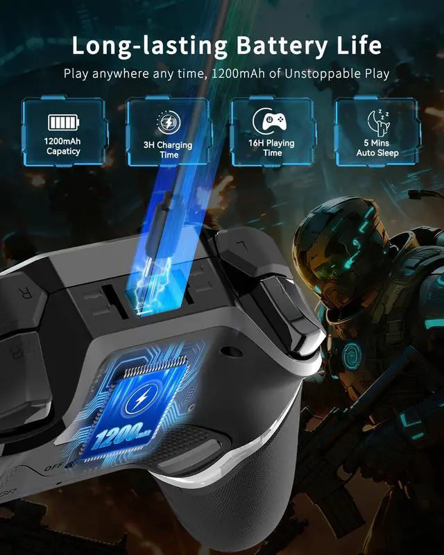 High-capacity BatteryPowered by a robust 1200mAh battery, mobile gaming controller charges fully in 3H and delivers up to 10-16H of continuous gameplay. Featuring seamless play-while-charging capability, your gaming never has to stop - stay battle-ready and never miss a moment of action.
