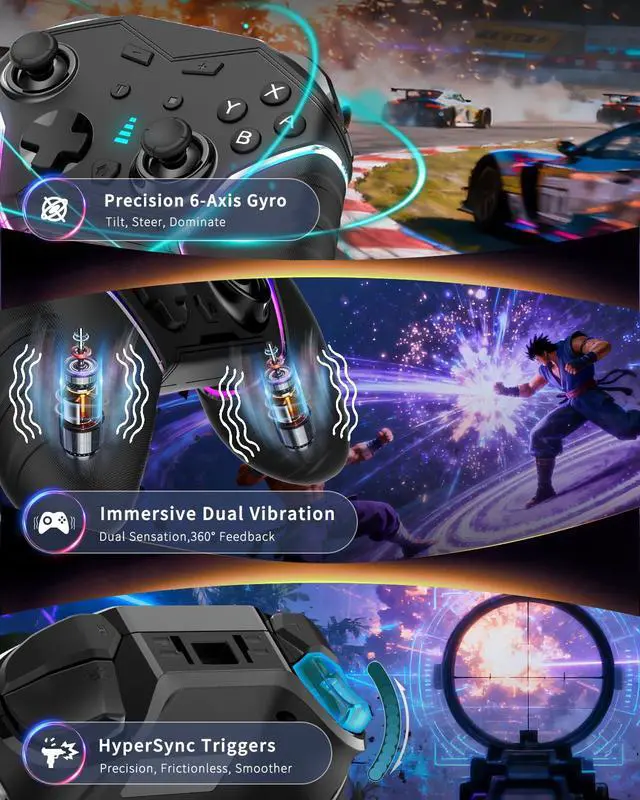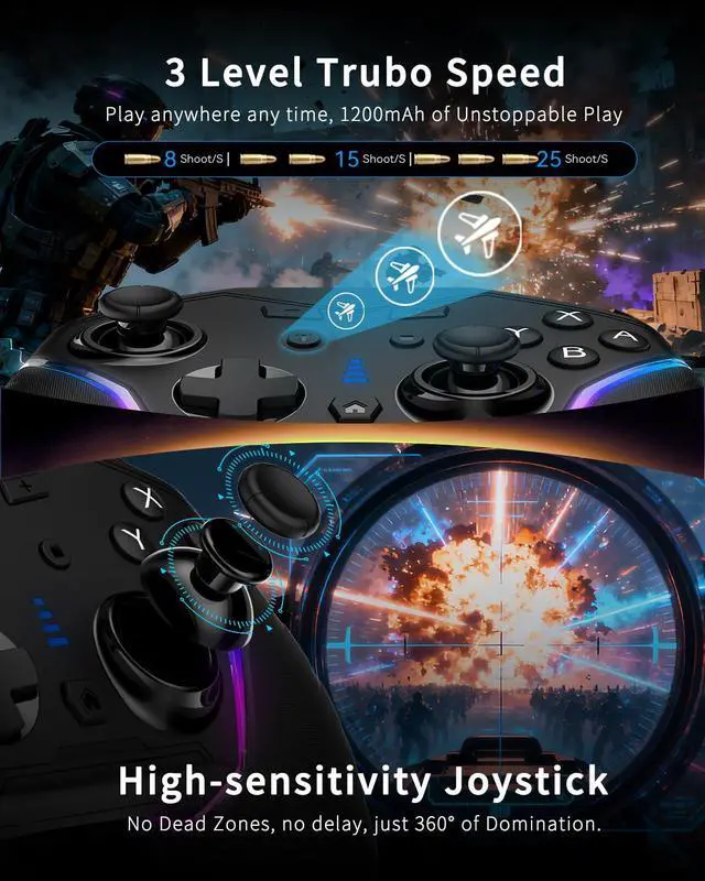 Enhance GameplayThe powerful dual motors of the PC controller deliver an immersive gaming experience; the integrated 6-axis gyroscope enables precise motion control and aiming for competitive gameplay; with three adjustable turbo speeds (8/15/25 shot/s). These three features work in synergy to elevate every aspect of your gaming experience.