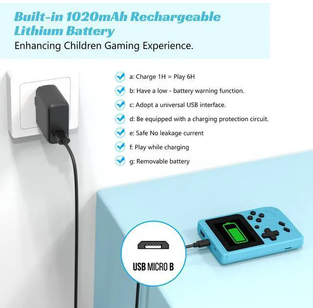 Rechargeable and Uninterrupted GamingOur mini handheld console is equipped with a rechargeable battery that can be easily charged via a convenient USB cable, making it the best choice for gaming on the go.
